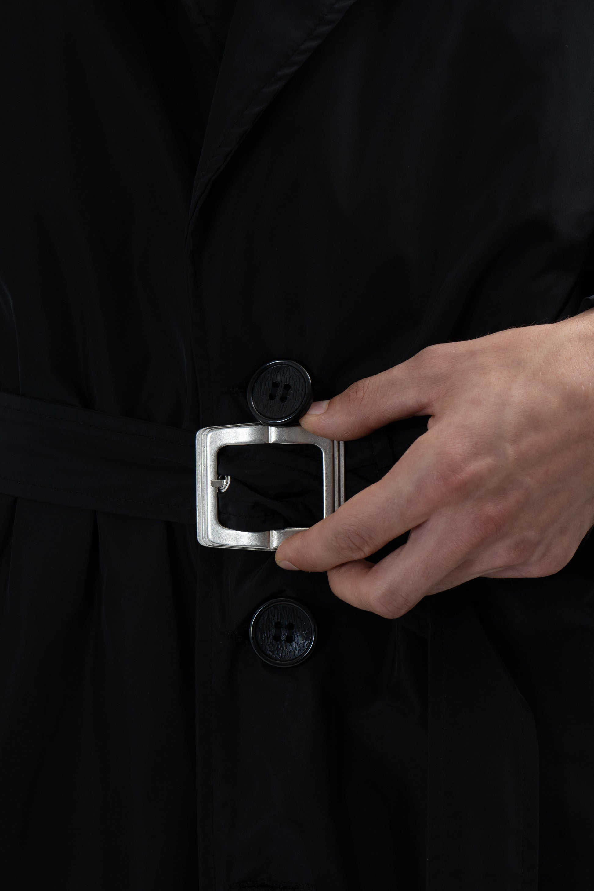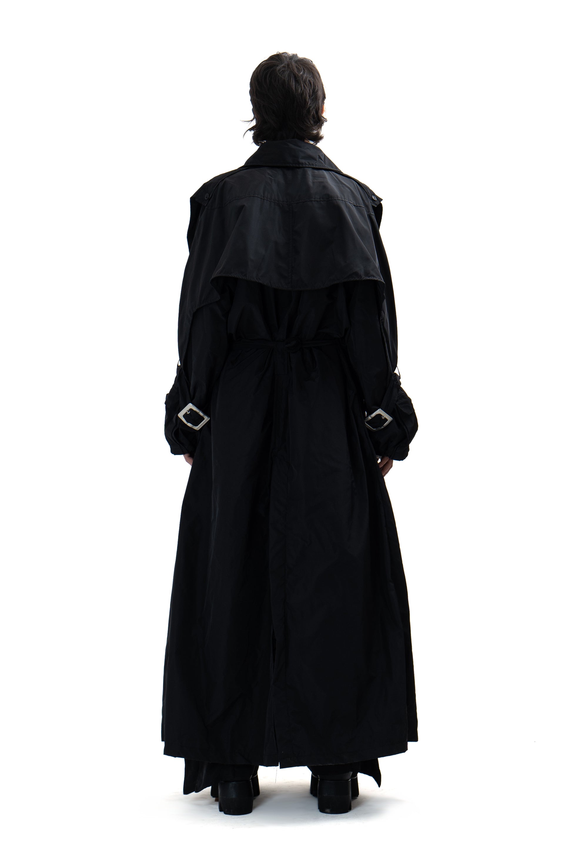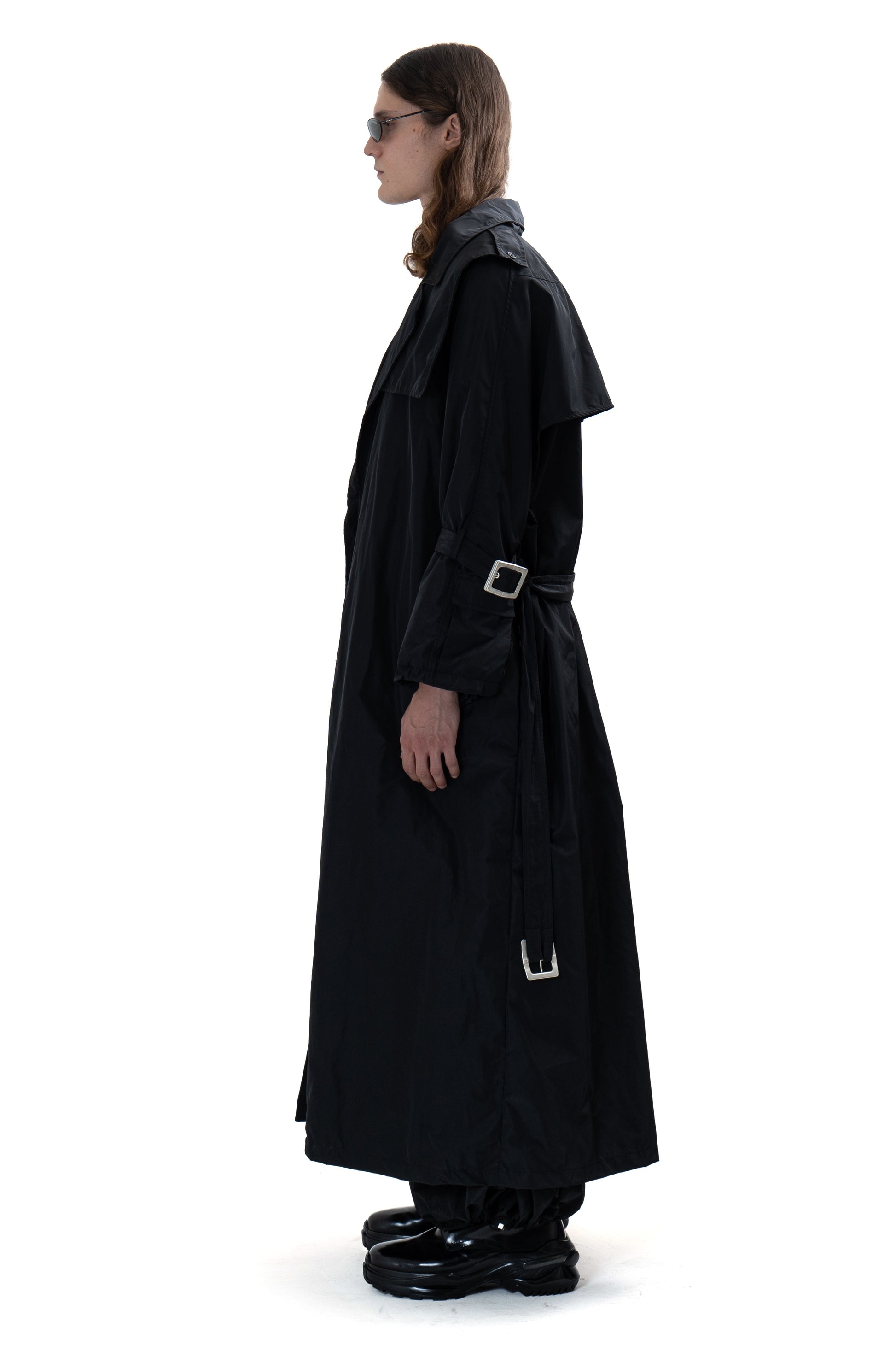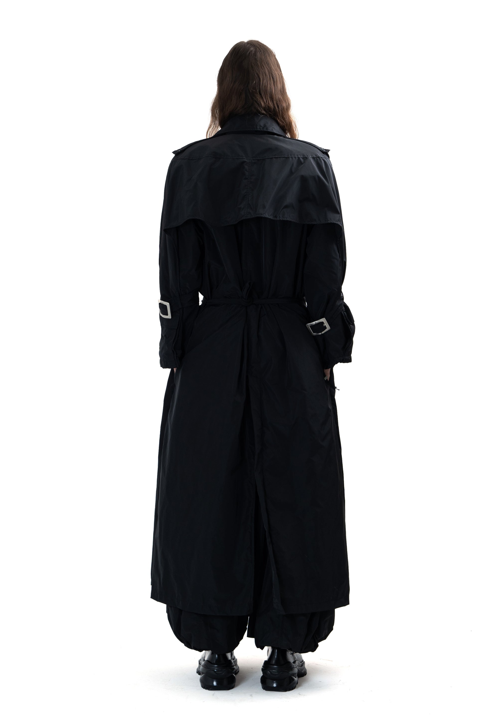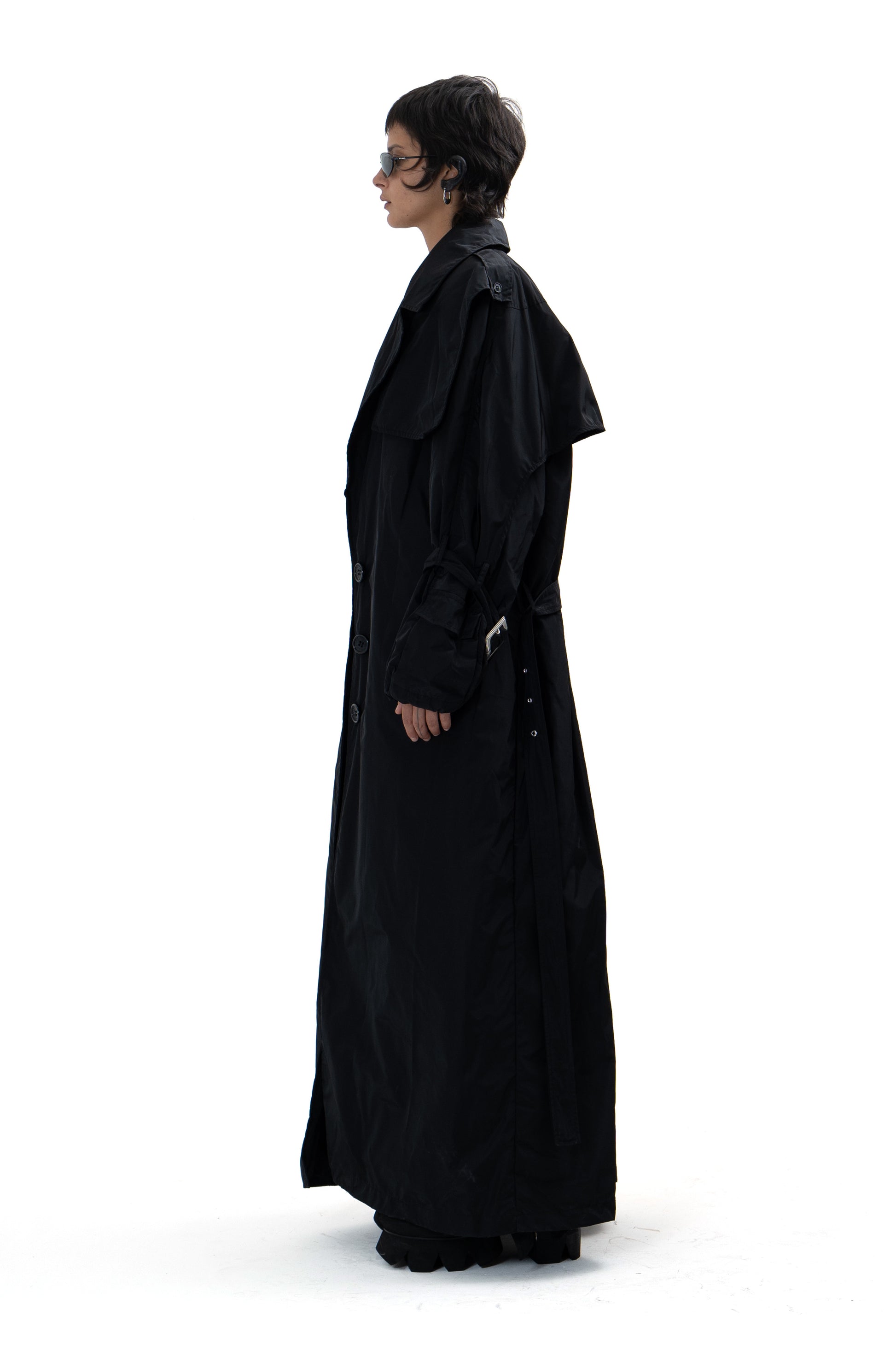 Long oversized padded trench coat with raglan shoulders and pockets at the bottom of the sleeves. Featuring metal details on the sleeves and belt, two large front pockets, and a flared hem. Versatile and comfortable, this streetwear trench is suitable for any gender, both male and female.